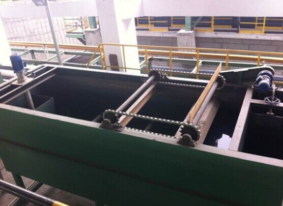 渦凹?xì)飧》Q為旋切氣浮,渦凹?xì)飧C(jī)是一種主要用于去除工業(yè)或城市污水中的油脂、膠狀物及固體懸浮物而設(shè)計的污水處理設(shè)備。系統(tǒng)主要由曝氣裝置、刮渣裝置和排渣裝置組成,其中曝氣裝置主要是渦凹曝氣機(jī),刮渣裝置主要由刮渣機(jī)和牽引鏈條組成,排渣裝置主要為螺旋推進(jìn)器,如下圖所示。工作時,溶氣設(shè)備由電機(jī)帶動高速旋轉(zhuǎn)(旋