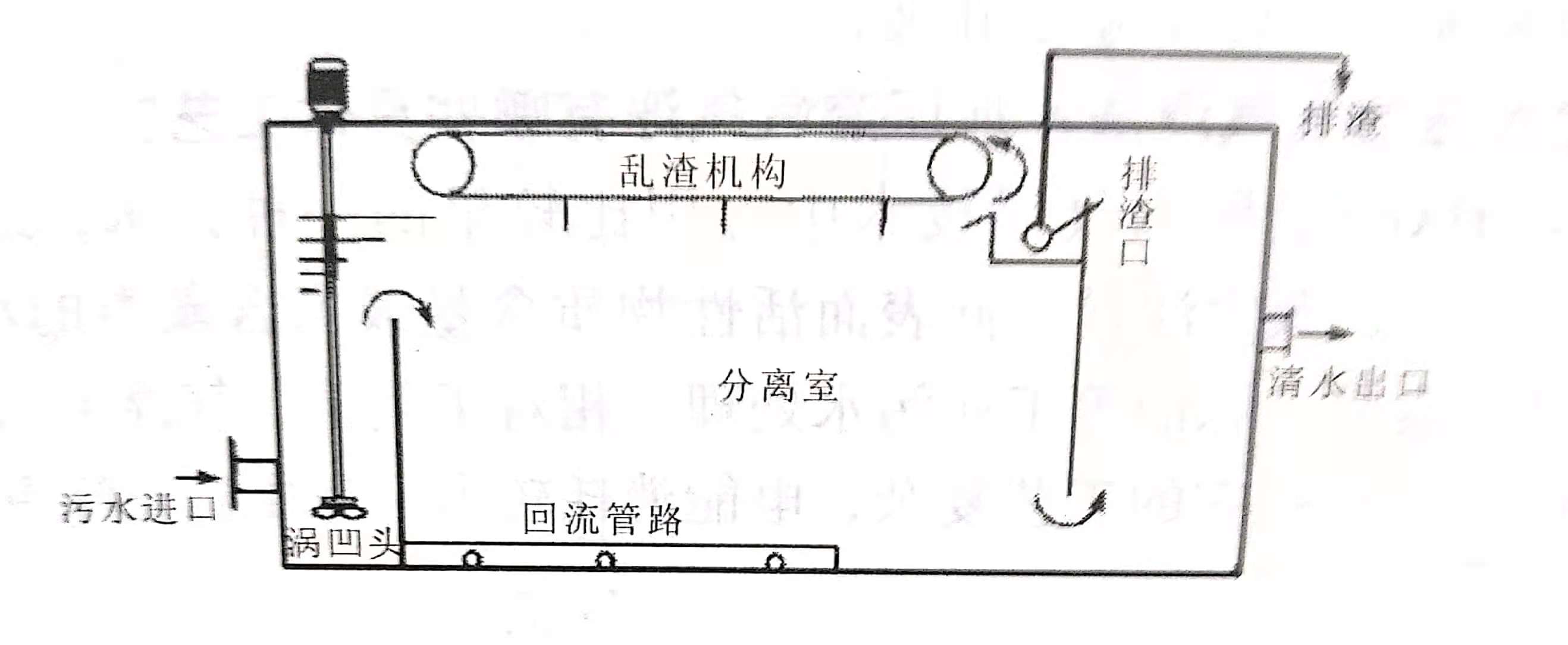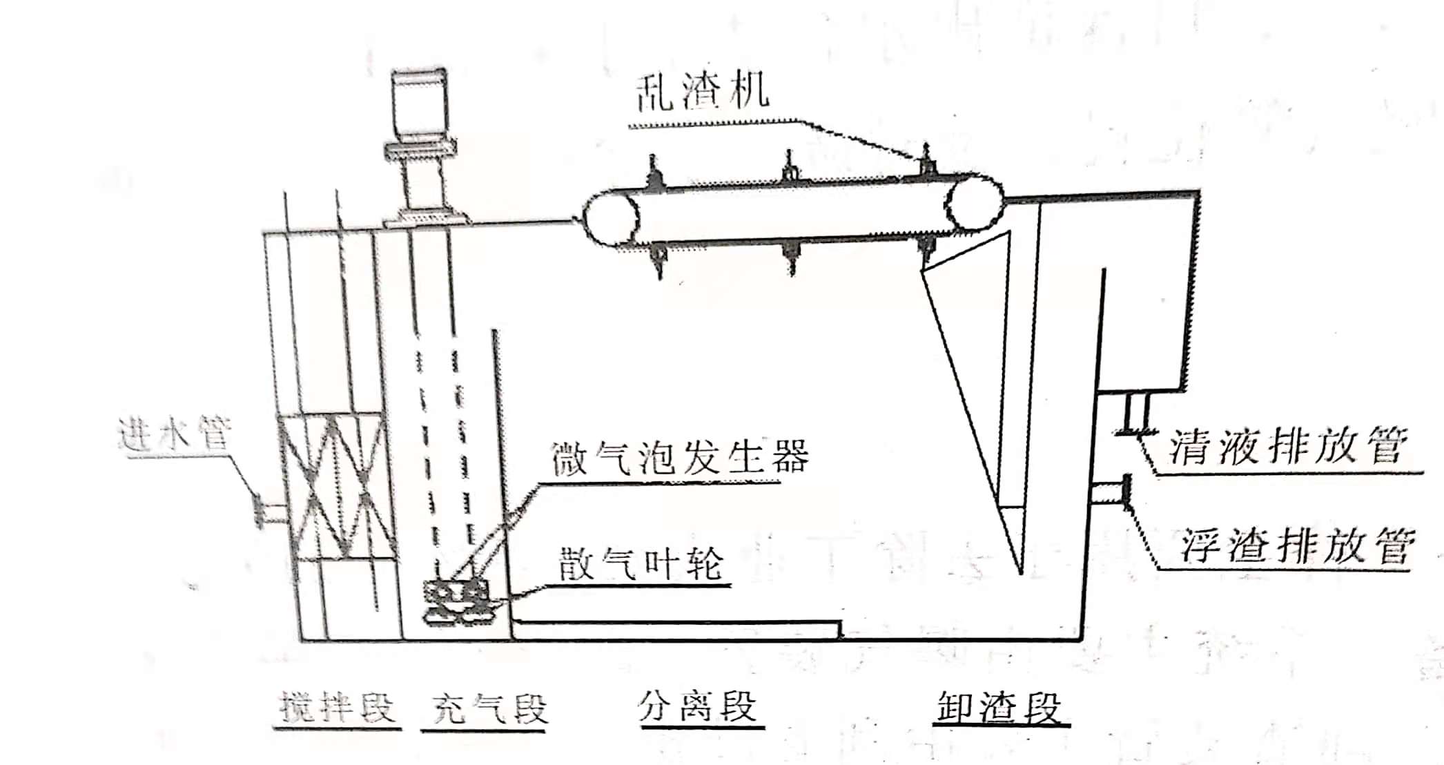 旋切式氣浮屬于引氣擴散氣浮,它與溶氣氣浮、噴射引氣氣浮、多級擴散氣浮及電解氣浮機理相同,因而同樣具有廣泛的應(yīng)用前景。其最大的優(yōu)點是形成的氣泡直徑與溶氣氣泡直徑相近,但其能耗卻小得多,而且不需要空壓機、溶氣罐、減壓釋放器等設(shè)施,占地面積小,基建投資也不大。旋切式氣浮機如下圖所示。