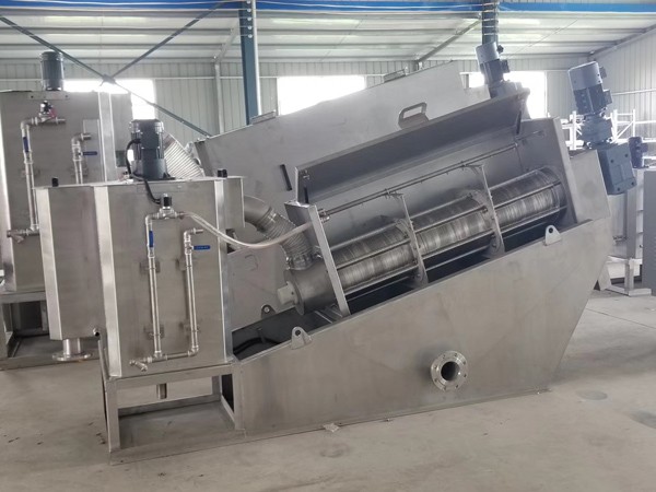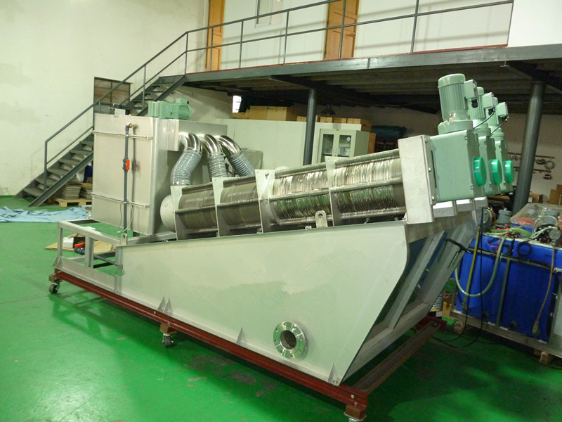 設(shè)備前端為濃縮段,后端為脫水段。污泥在濃縮段經(jīng)重力脫水后,被運輸?shù)矫撍?,在前進過程中隨著慮縫及螺距的逐漸變小,以及背壓板的作用下,產(chǎn)生極大的內(nèi)壓,容積不斷縮小,達到充分脫水的目的,